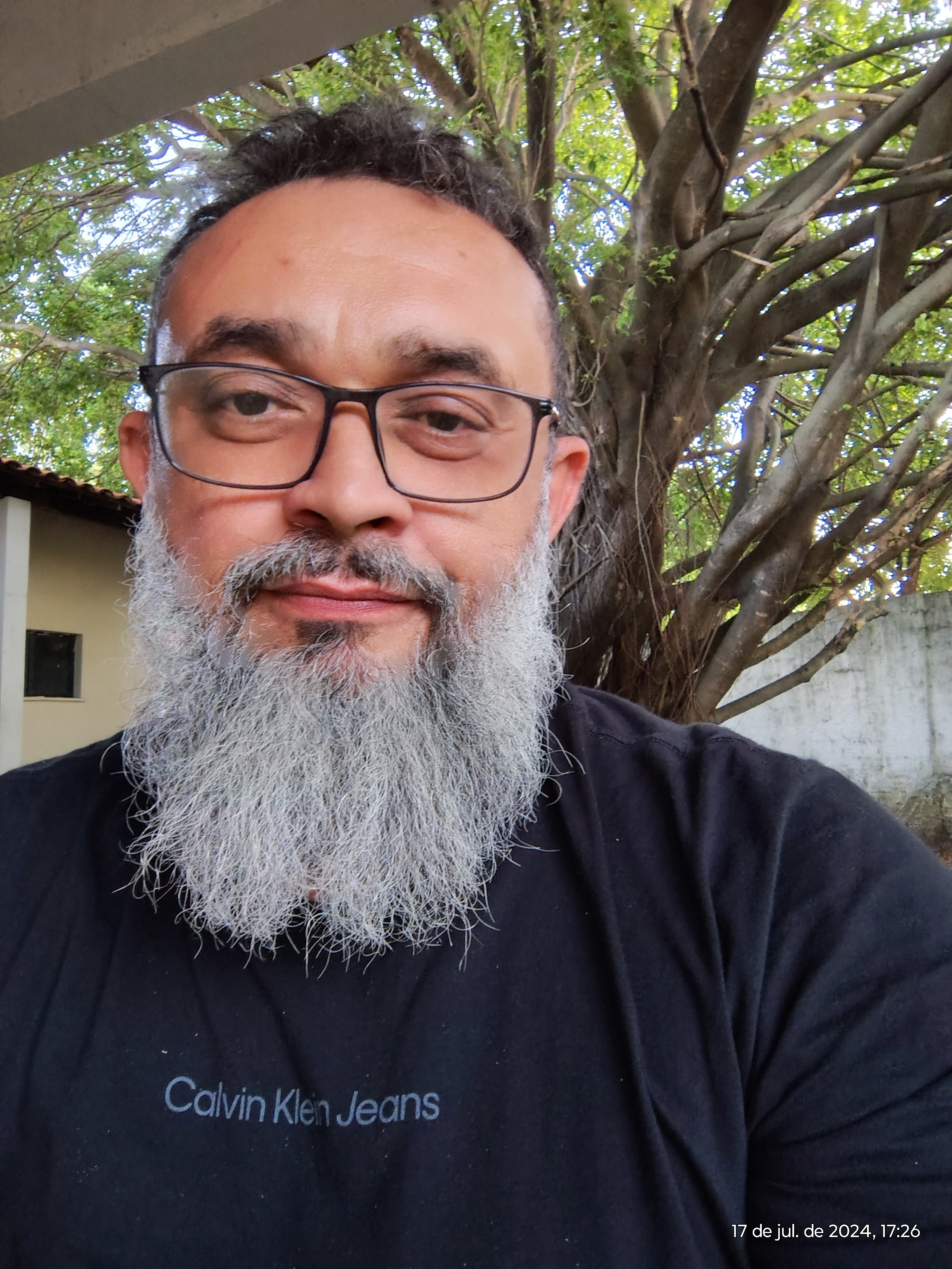 A imagem mostra um homem com uma longa barba grisalha e cabelo curto, usando óculos e uma camisa preta com o logotipo “Calvin Klein Jeans” estampado no peito. Ele está em um ambiente externo, com uma árvore grande e galhos densos ao fundo. A iluminação natural destaca o rosto e os detalhes da barba, criando uma atmosfera tranquila e natural. A expressão facial é neutra, transmitindo uma aparência calma e acolhedora. No canto inferior direito, há uma marcação de data e hora: “17 de jul. de 2024, 17:26.”